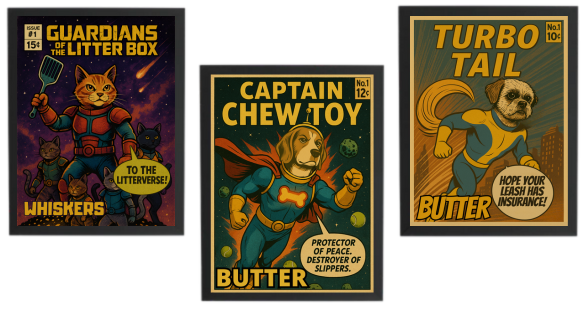 Our skilled team get to work turning you pet into a heroic (or villain) portrait with bold colors and dynamic expression